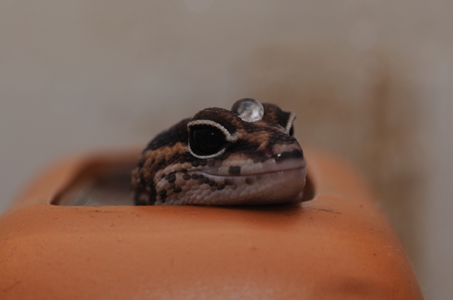 ―通常ヤモリには瞼(まぶた)は存在しません。しかしトカゲモドキはヤモリでありながらにして瞼があり、まばたきをしたり目を閉じる事ができます(上写真参照)。瞳まで鱗に覆われていて瞬きできないヤモリや蛇達と比べると、より原始的な構造とも言えます。